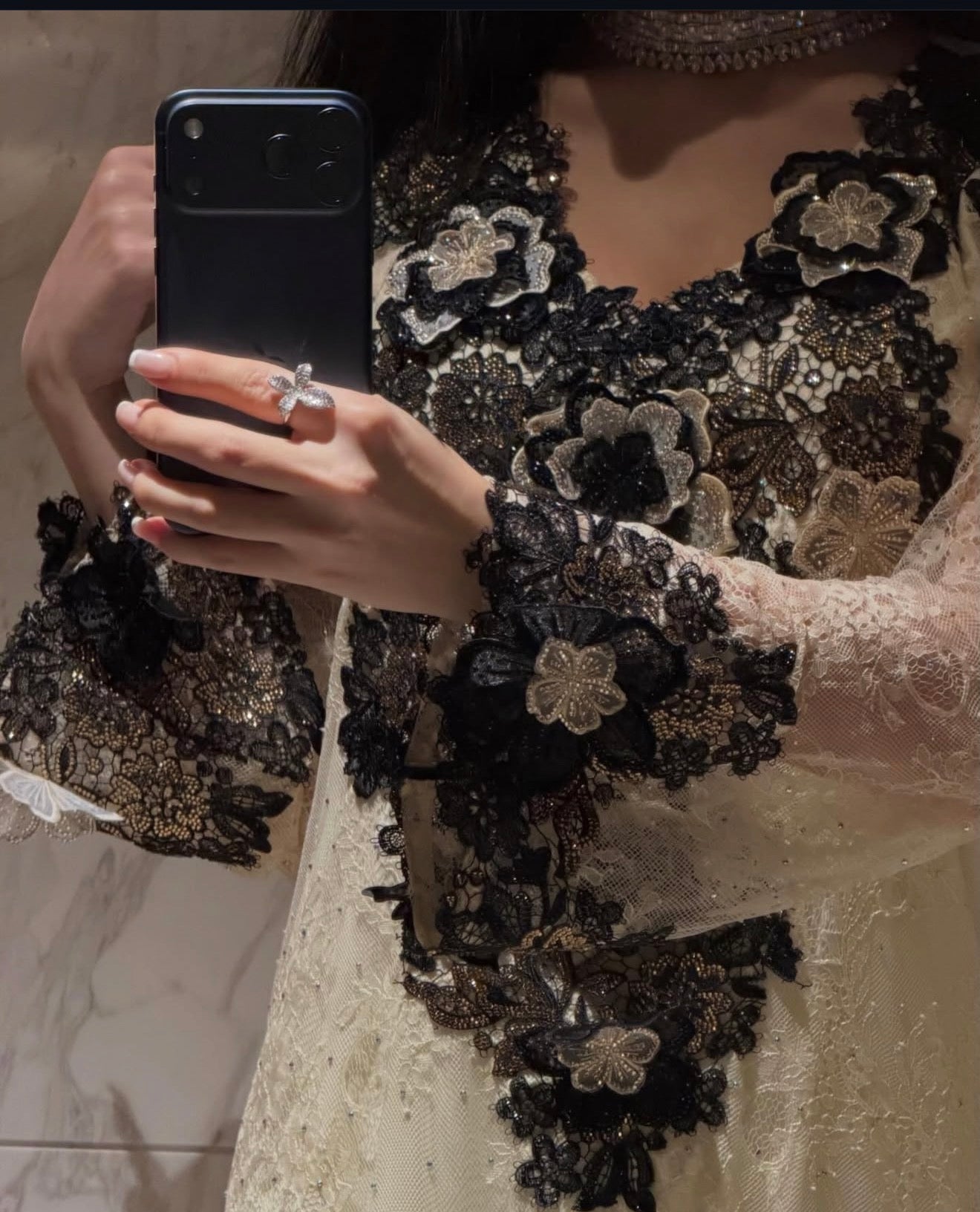 Step into timeless sophistication with this beautifully handcrafted dress. Made from luxurious tulle fabric, it features delicate multicolored floral embroidery accented with shimmering pearls and sequins that catch the light with every movement.