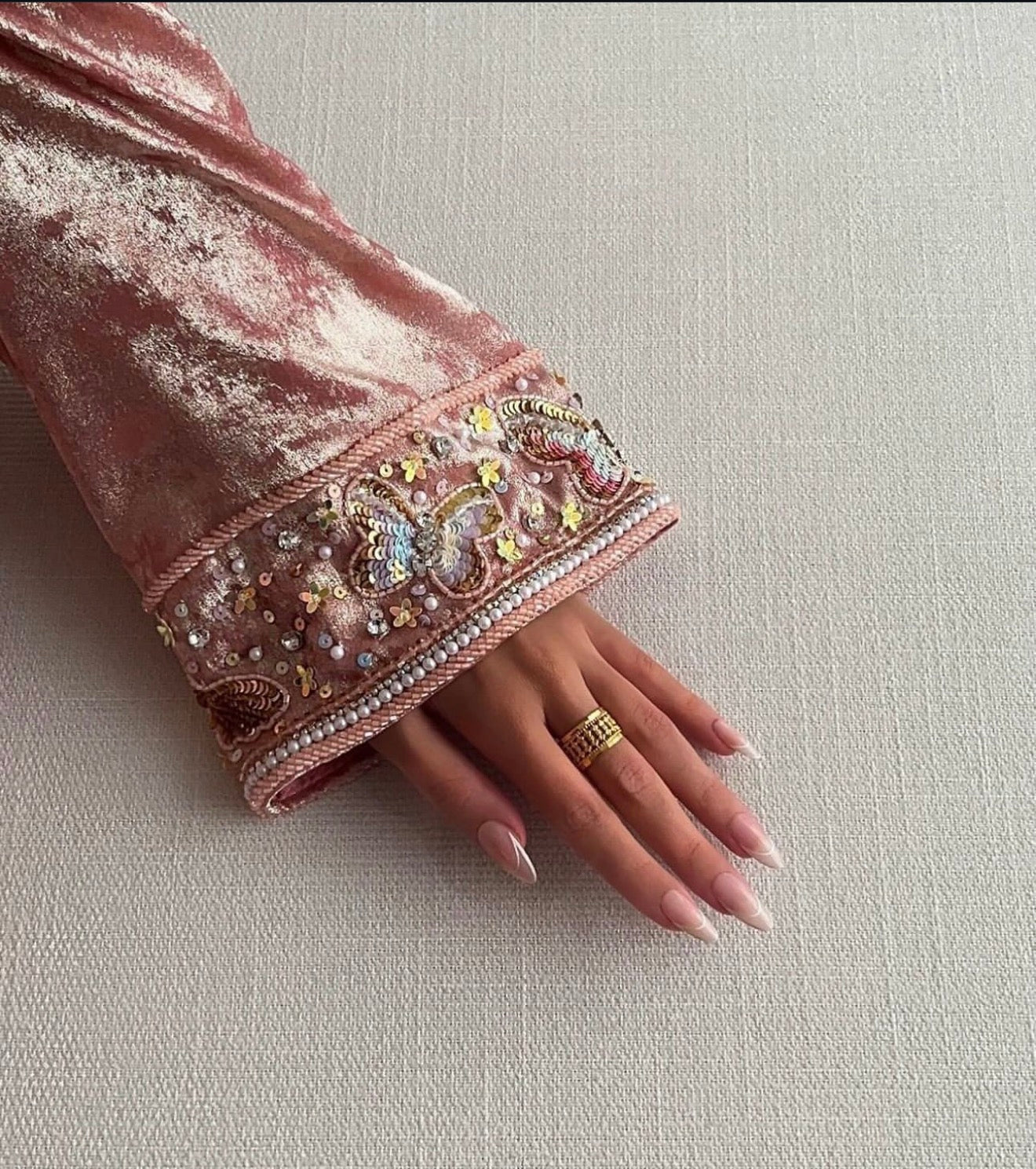 The sleeves and neckline are elevated with intricate couture embroidery, blending florals and butterflies in a harmonious botanical design. Paired with its soft, dreamy silhouette, this mkhawer delivers both sophistication and comfort—perfect for special events, elegant evenings, and VIP occasions.
