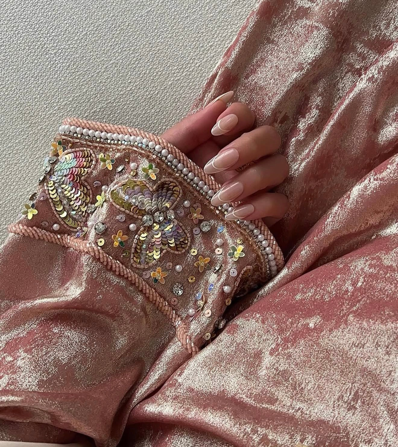 This breathtaking piece features a hand-embellished butterfly motif, adorned with shimmering crystals, glass beads, and delicate pastel threadwork. The soft nude-blush base is complemented by a flowing sheer overlay, creating an ethereal, luminous finish that catches the light beautifully in every movement.
