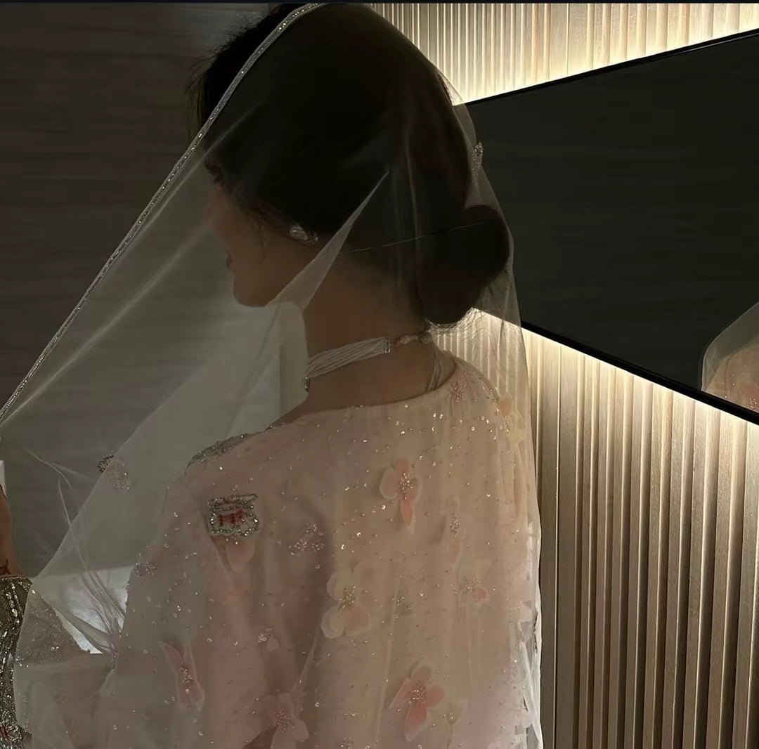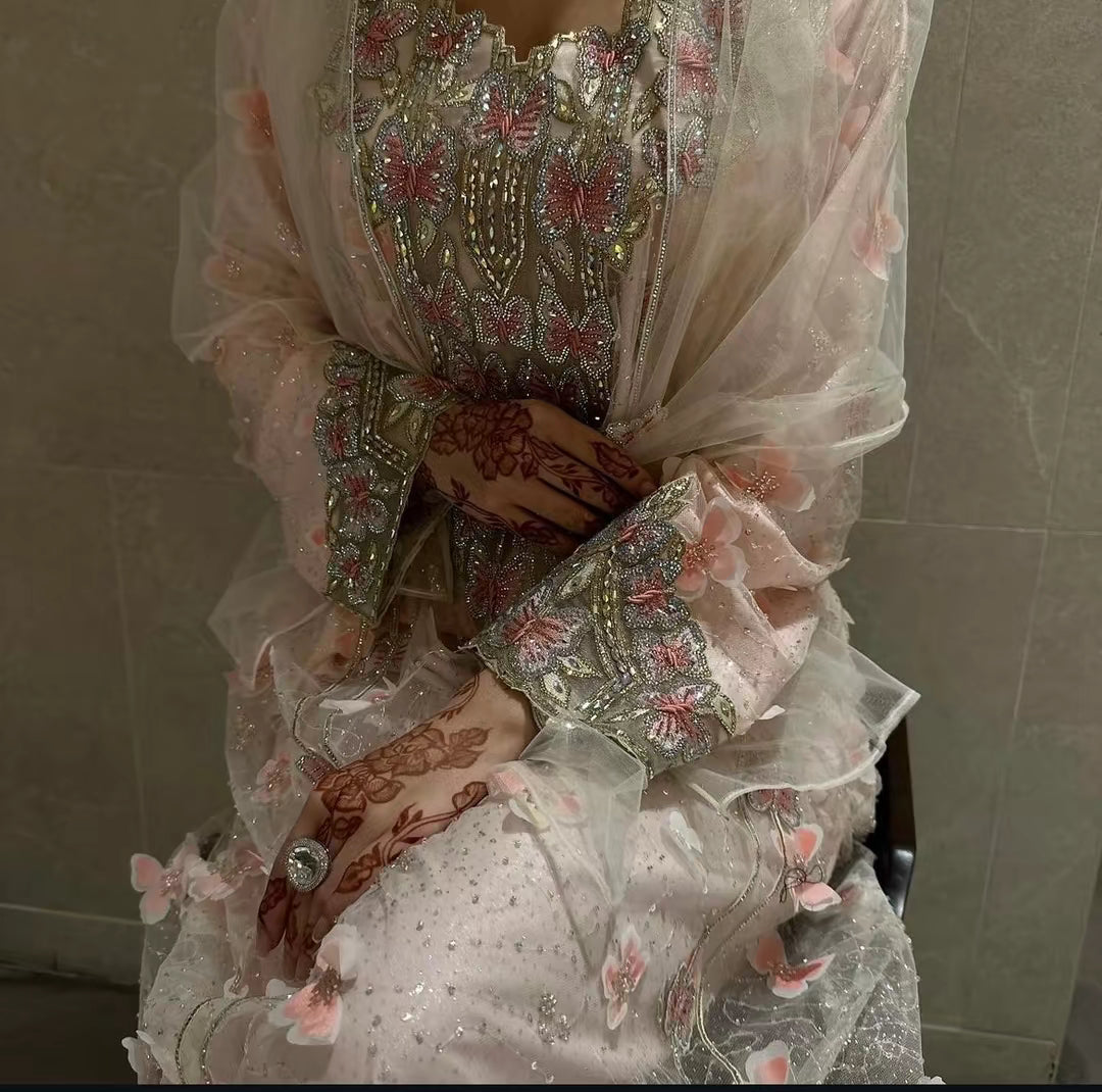 The sleeves and neckline are elevated with intricate couture embroidery, blending florals and butterflies in a harmonious botanical design. Paired with its soft, dreamy silhouette, this mkhawer delivers both sophistication and comfort—perfect for special events, elegant evenings, and VIP occasions.