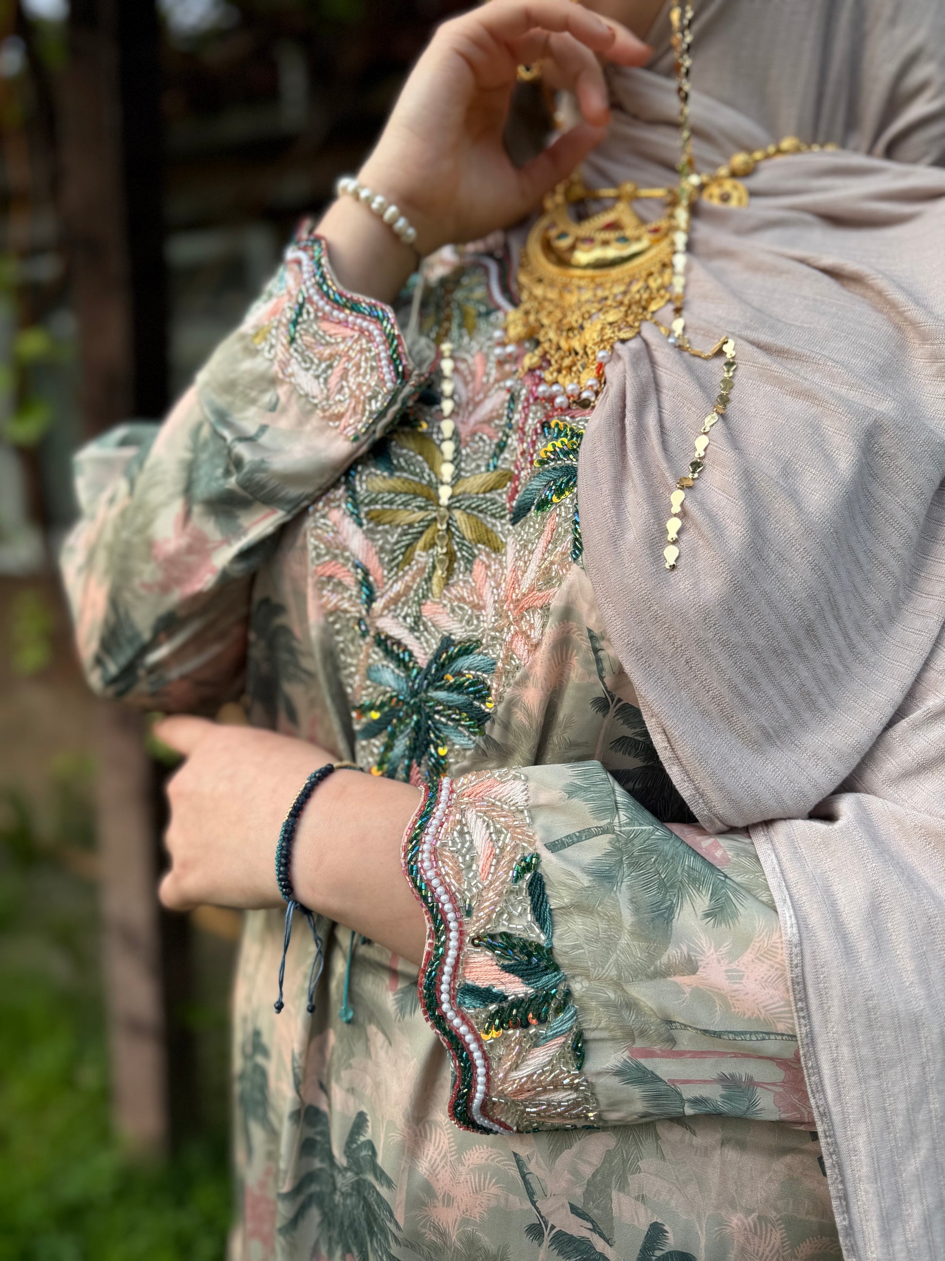 Our VIP Makhawer is a true work of art, crafted from the finest Italian silk and adorned with intricate hand-beaded embellishments. Every detail is meticulously designed by skilled artisans, ensuring a luxurious and elegant finish. The soft, flowing silk drapes beautifully, while the delicate beading adds a touch of shimmer and sophistication. Perfect for those who appreciate timeless craftsmanship, this Makhawer is a statement piece that exudes grace and refinement.