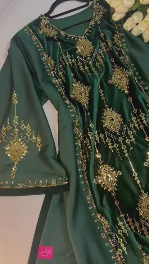The dress’s fitted silhouette is complemented by a matching draped shawl, adding an effortless touch of grace and modesty. Perfect for special occasions, this piece embodies refined femininity and classic couture craftsmanship.