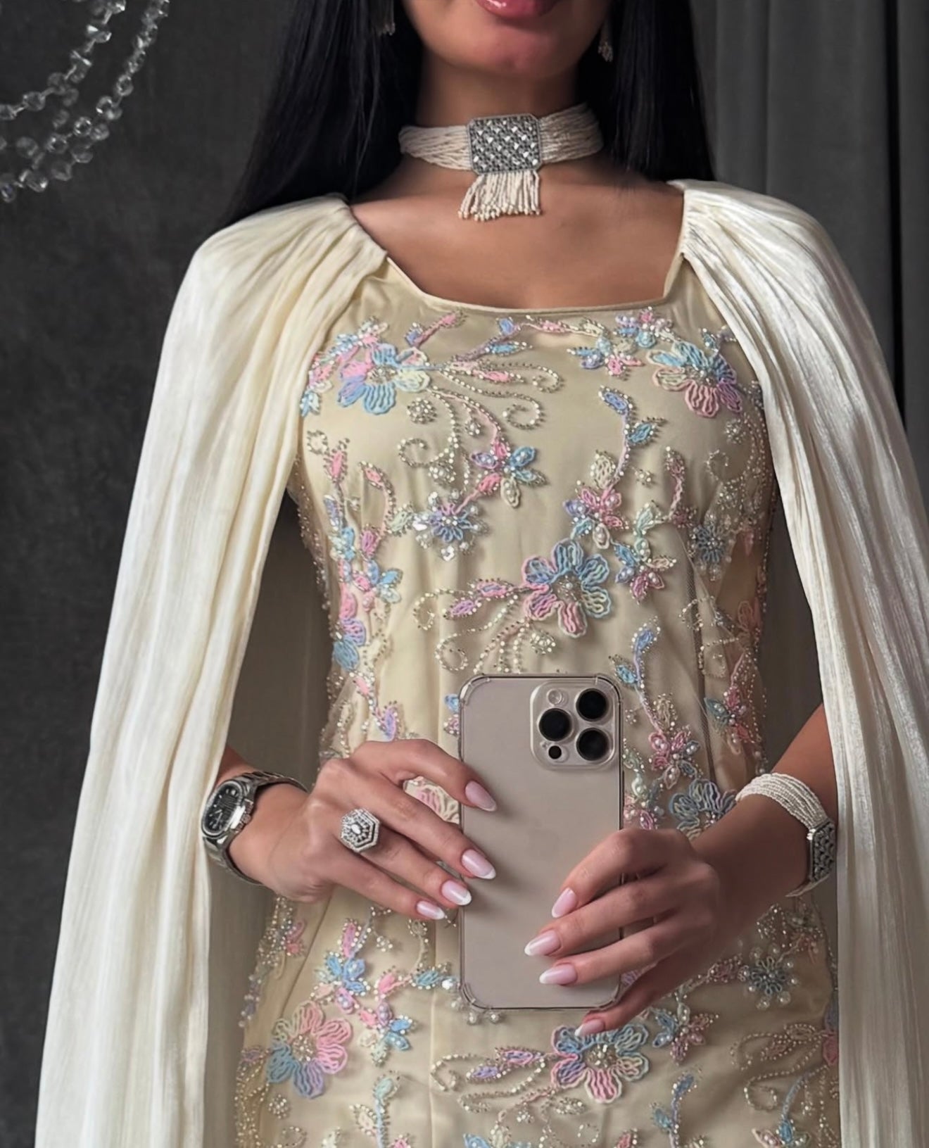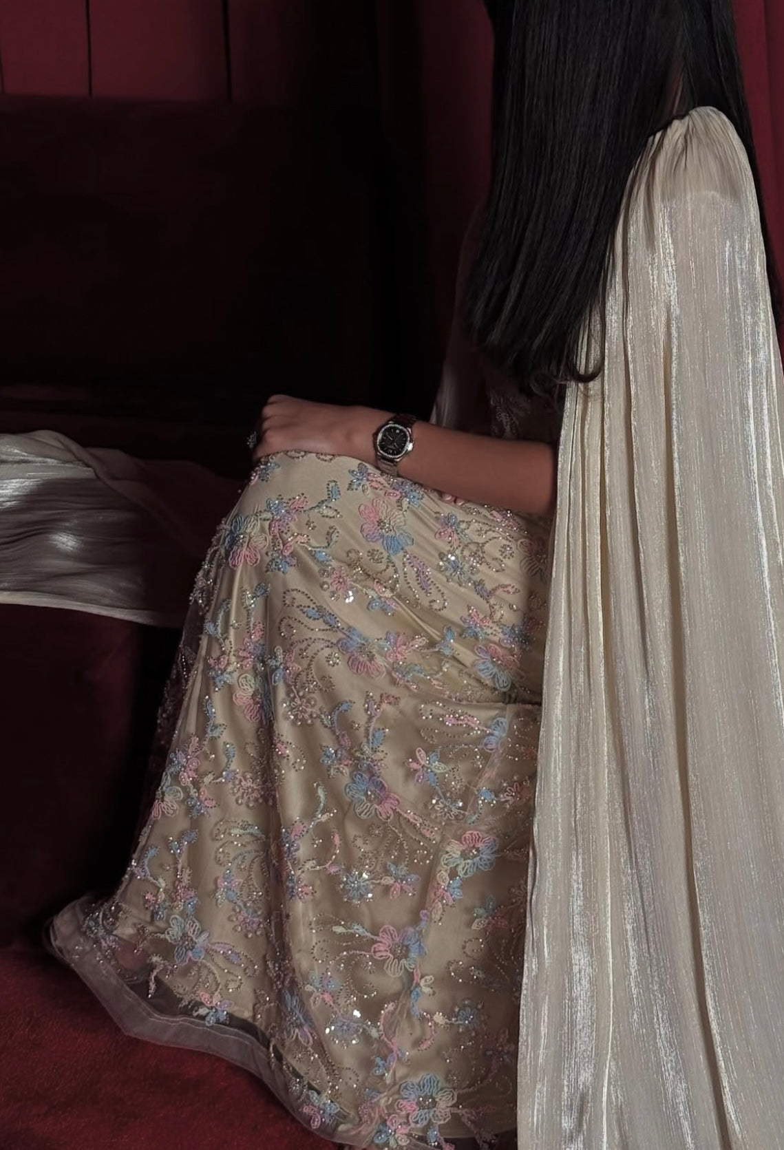Step into timeless sophistication with this beautifully handcrafted dress. Made from luxurious tulle fabric, it features delicate multicolored floral embroidery accented with shimmering pearls and sequins that catch the light with every movement.