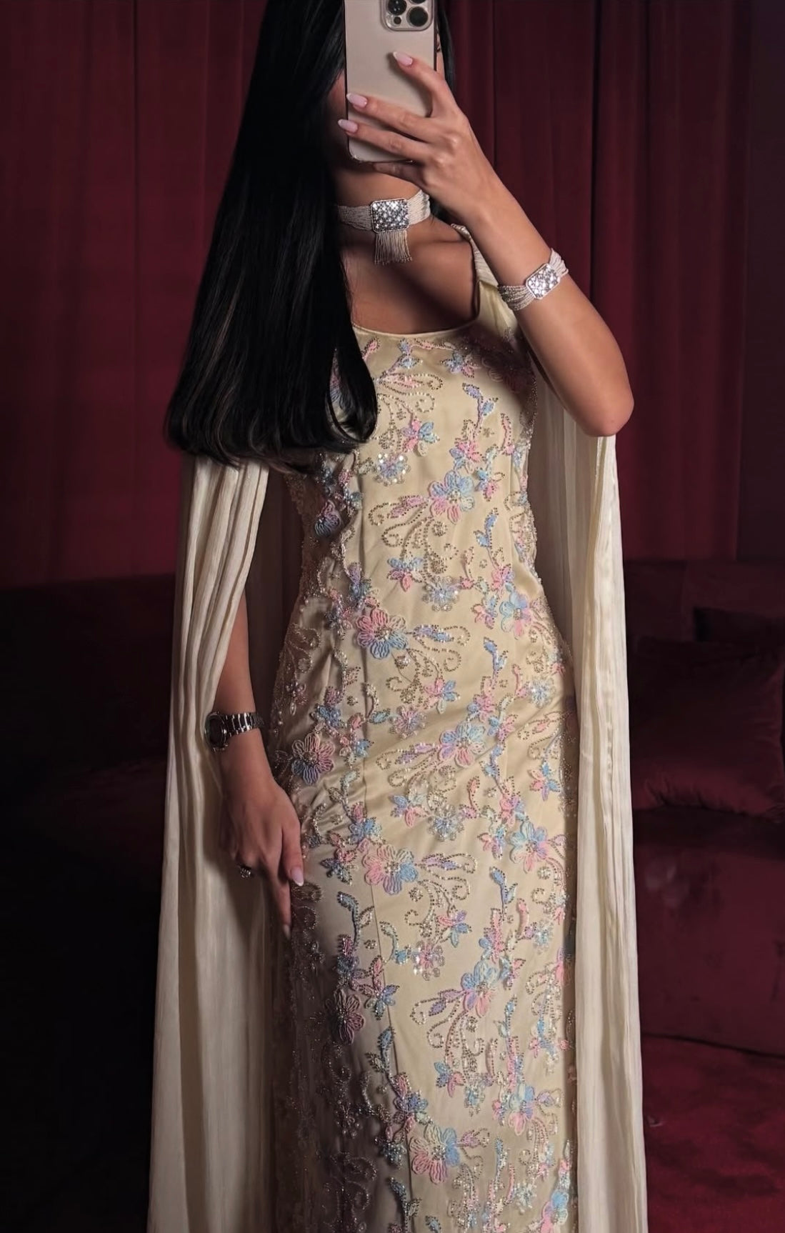 The dress’s fitted silhouette is complemented by a matching draped shawl, adding an effortless touch of grace and modesty. Perfect for special occasions, this piece embodies refined femininity and classic couture craftsmanship.