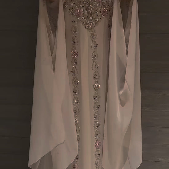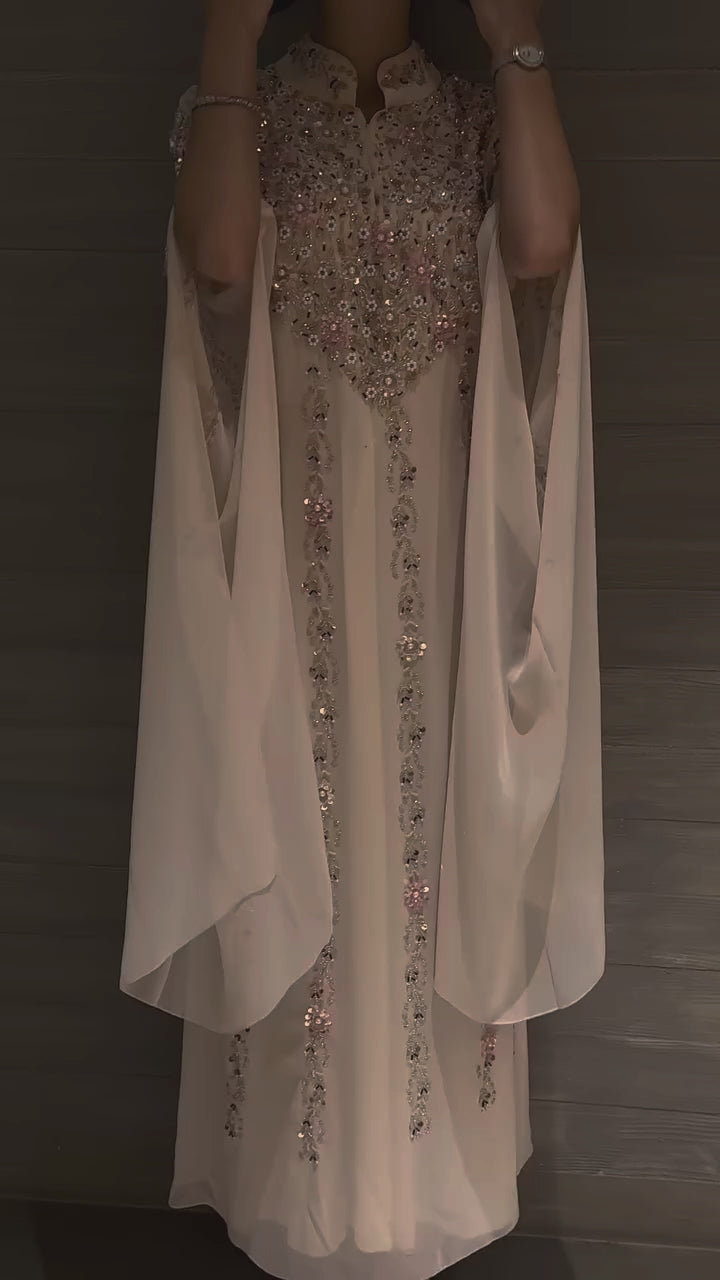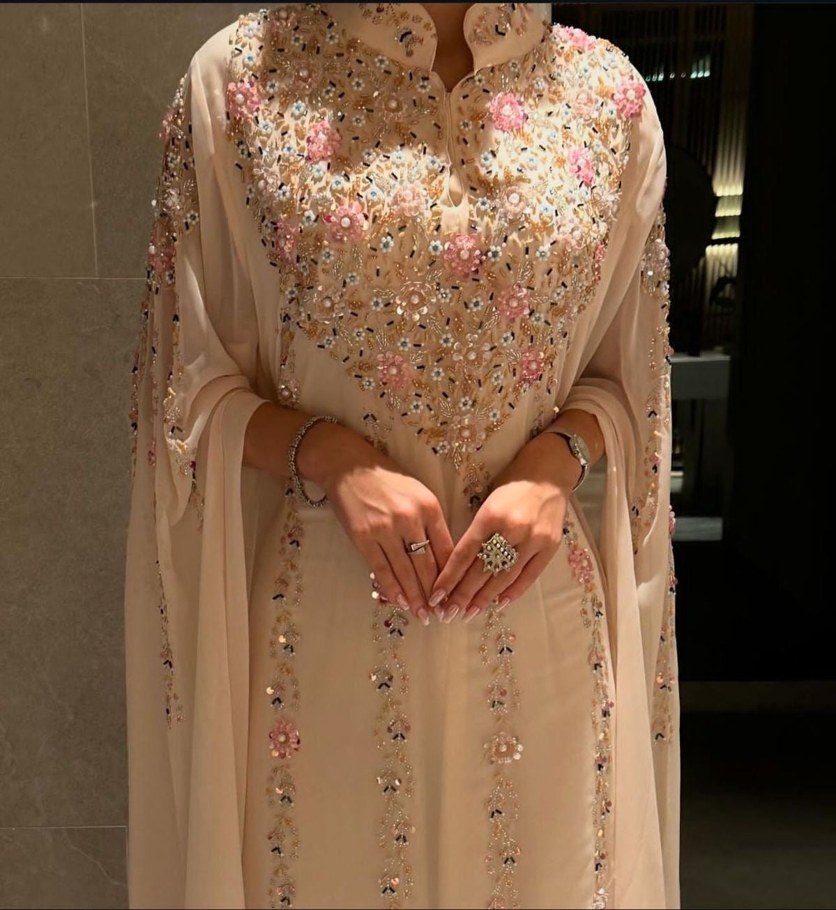 The sleeves and neckline are elevated with intricate couture embroidery, blending florals and butterflies in a harmonious botanical design. Paired with its soft, dreamy silhouette, this mkhawer delivers both sophistication and comfort—perfect for special events, elegant evenings, and VIP occasions.